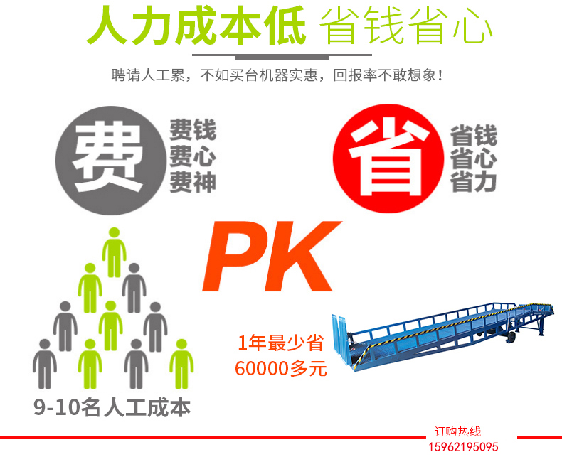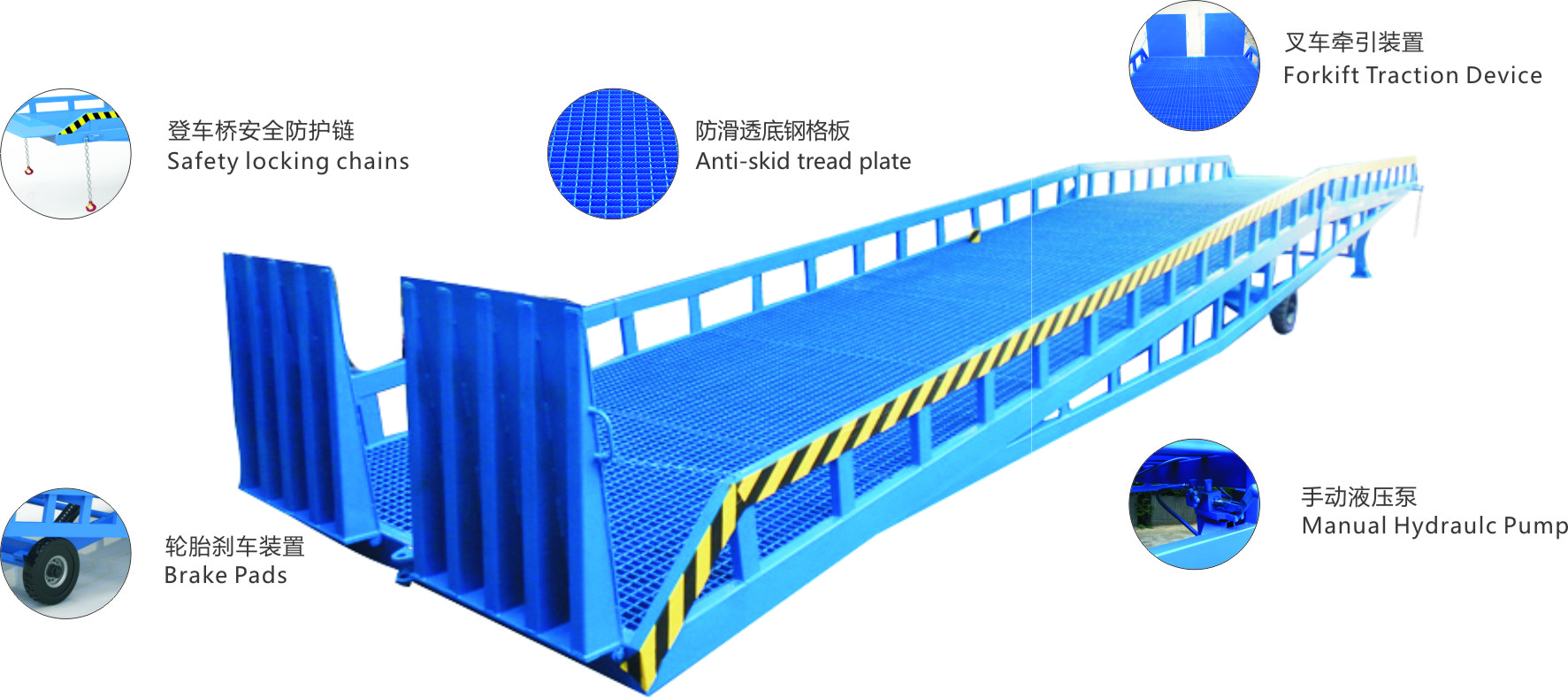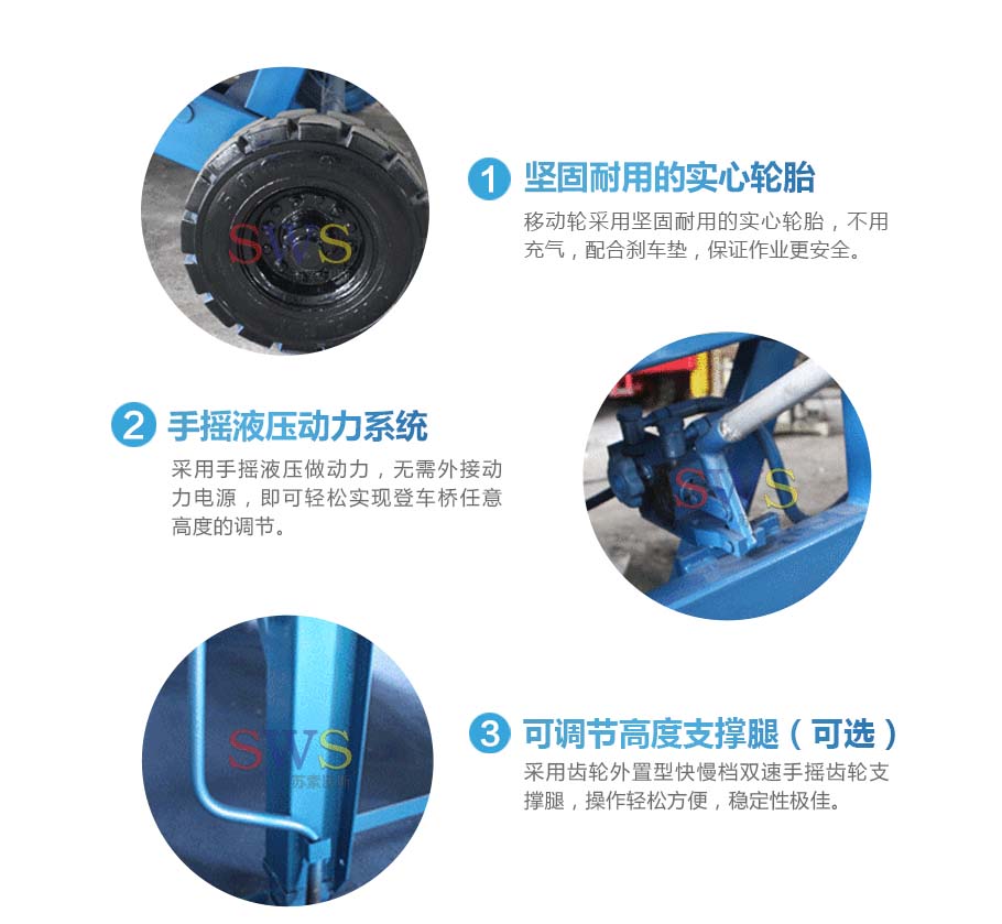 采用人工液壓動力,勿須外接動力電源即可輕松實(shí)現(xiàn)登車橋的高度調(diào)節(jié)。