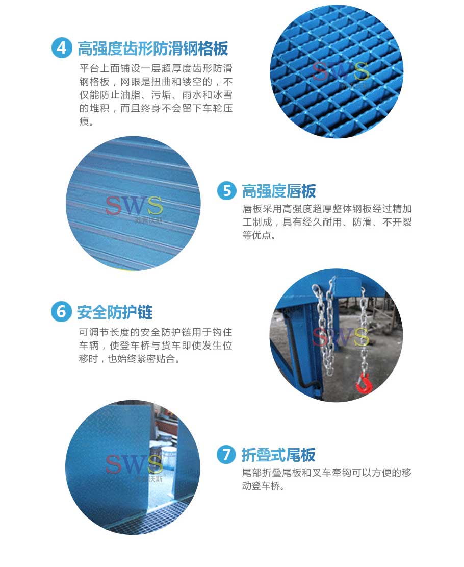 5. 橋體與集裝箱連接處有帶掛鉤的鏈條,使汽車和登車橋緊密連接,保證工作時的安全可靠性。
