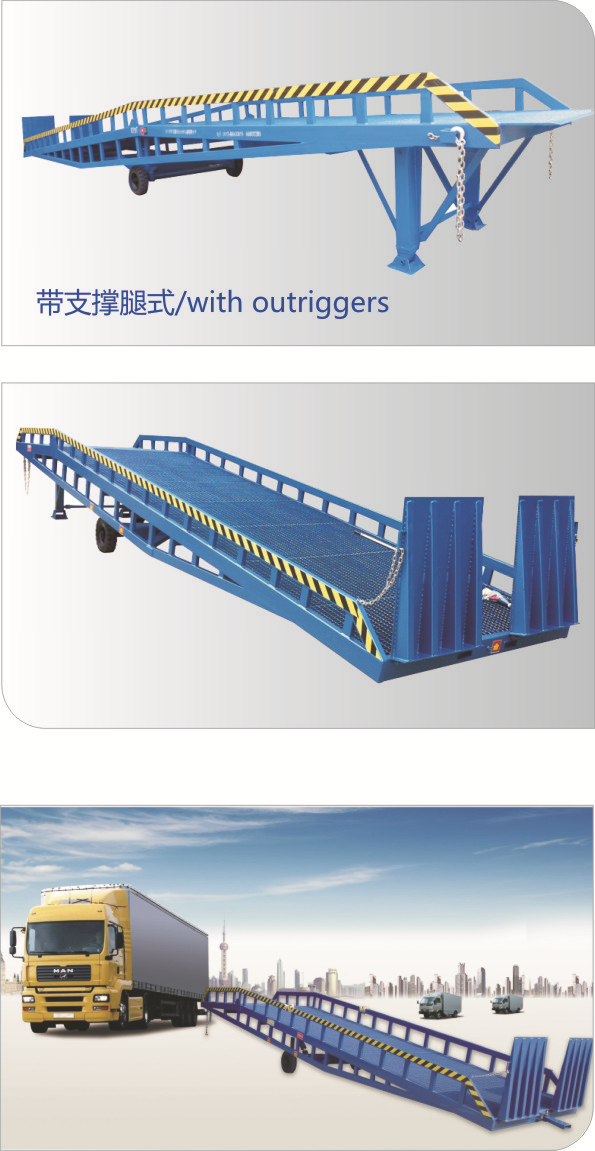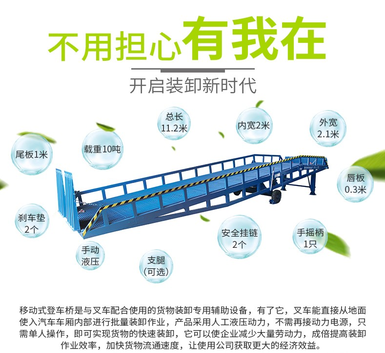 移動液壓登車橋是與叉車配合使用的貨物裝卸專用輔助設(shè)備,有了它,叉車能直接從地面進(jìn)入汽車車廂內(nèi)進(jìn)行裝卸貨物的作業(yè)。能夠提高貨物裝卸速度,節(jié)省裝卸工作的時間以及人力,是您裝卸貨物的得力助手。只需單人操作,不需動力電源,即可實(shí)現(xiàn)貨物的安全快速裝卸。移動式登車橋用于無裝卸設(shè)備的貨臺及流動裝卸場所,是與叉車配合使用的貨物裝卸輔助設(shè)備。可根據(jù)汽車車廂的高低調(diào)節(jié)高度,叉車可以直接通過本設(shè)備駛?cè)胲噹麅?nèi)部進(jìn)行貨物的批量裝裝卸。