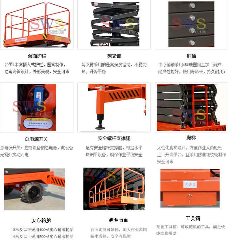 3、剪叉為高強(qiáng)度錳鋼矩形管,強(qiáng)度高、不變形